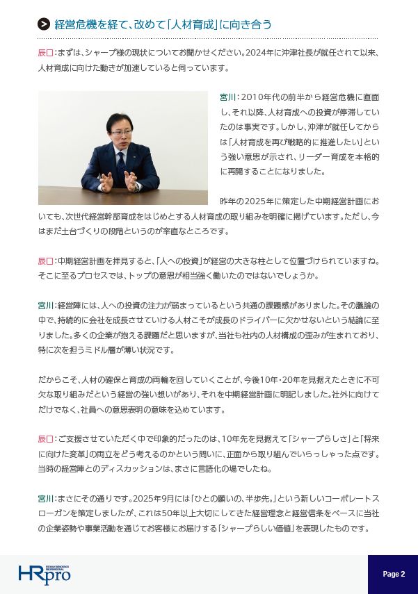 シャープ株式会社の人事総務統轄部 統轄部長宮川直之氏との対談記事を通じて、