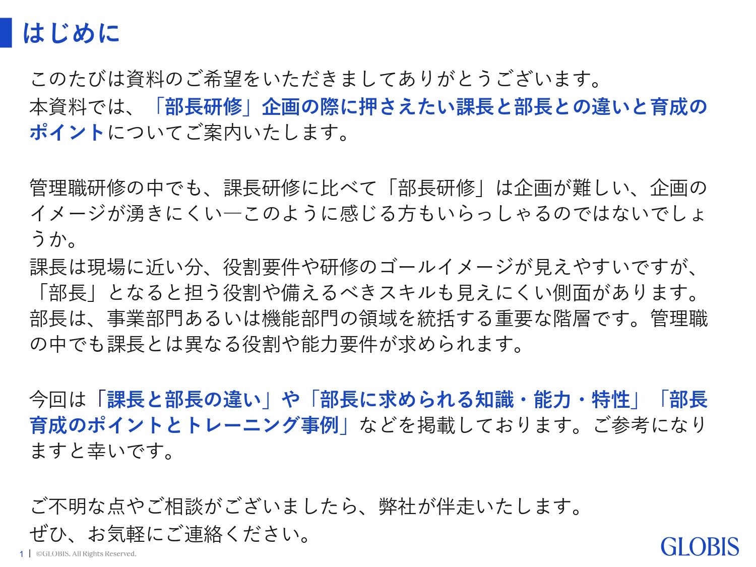 本資料では、部長と課長の役割の違いを比較表でわかりやすく整理し、さらに、部長に特有の課題や成長に必要なスキルを解説しています。