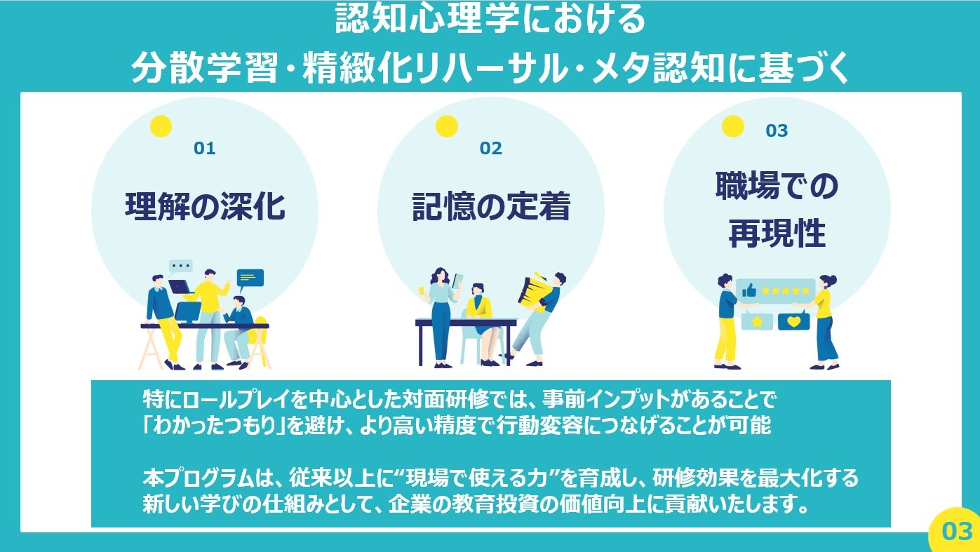 動画学習で知識を、テストで理解を、対面でのロールプレイで行動きめ細かく習得。認知心理学に基づき「わかったつもり」を排除し、再現性を高めます。