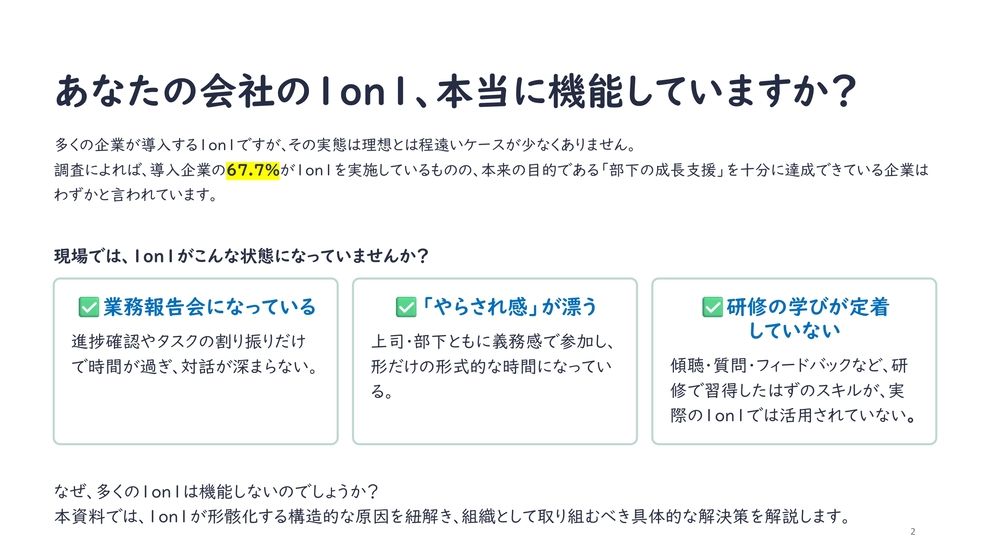 近年、多くの企業で導入が進む1on1。しかし実態としては、「業務報告の場になっている」「形だけで終わっている」といった声も少なくありません。本来の目的である“部下の成長支援”につながっていないケースが多いのが現状です。