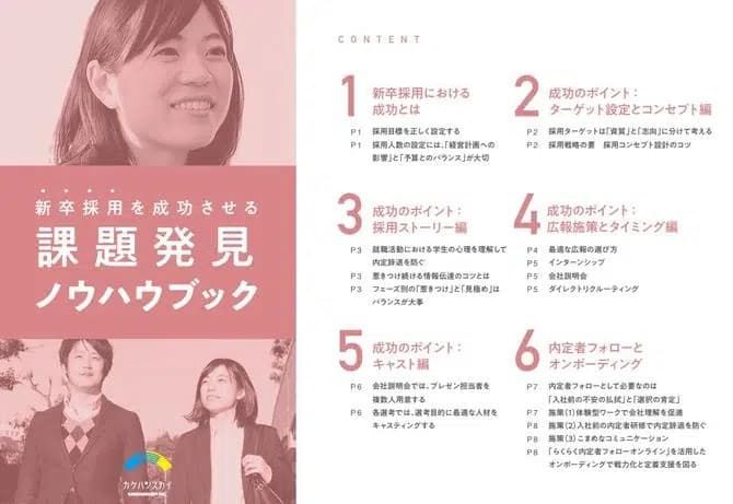 採用課題発見に役立つフローチャートや、オンライン・リアルにかかわらず新卒採用のベースとなるノウハウをまとめたお役立ち資料です。