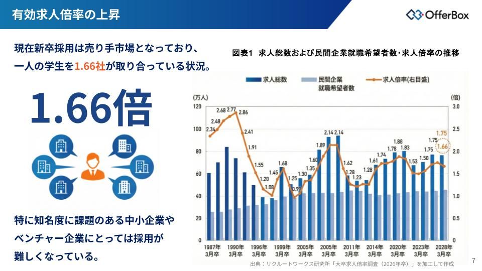 現在の新卒採用市場は有効求人倍率が1.66倍に上昇し、1人の学生を複数社で取り合う売り手市場となっています。