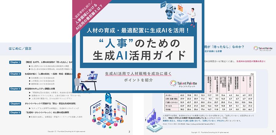 Chapter4以降では、タレントマネジメントシステム「タレントパレット」が実践する、入力情報が外部学習に利用されない“セキュア”なAI基盤や、具体的な活用機能(AIによる目標・評価フィードバック支援 、社内スカウト等)、実際の導入成功事例までを詳しくご紹介します。
