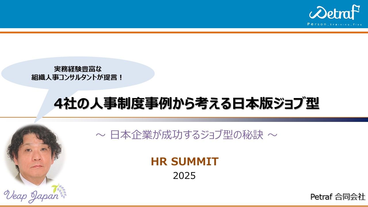 本講演では、単なる制度輸入でもなく日本企業の文化や働き方に根ざした“日本流”で業態に即した人事制度をどう設計してどう運用しているかを4社の事例をもとに紹介しています。