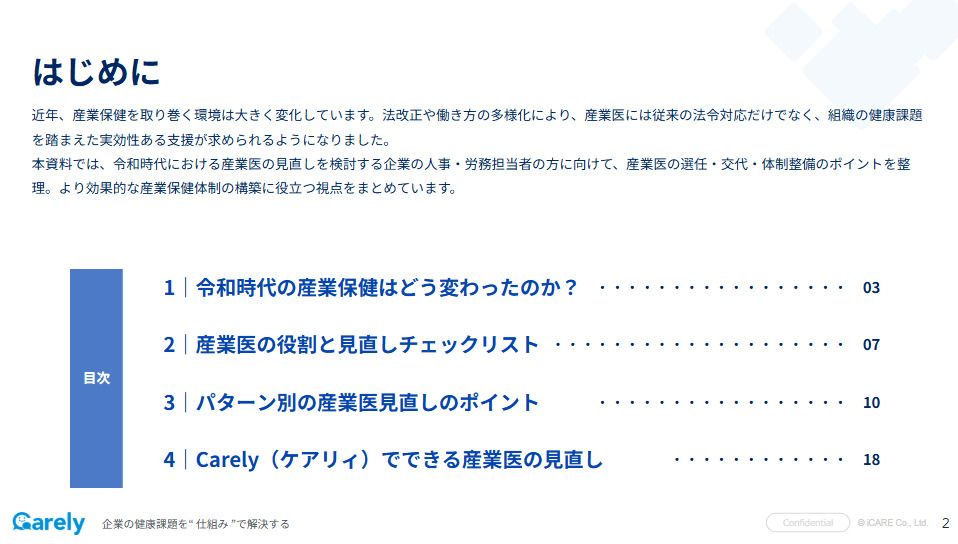 本資料では、令和時代における産業医の見直しを検討する企業の人事・労務担当者の方に向けて、産業医の選任・交代・体制整備のポイントを整理。
