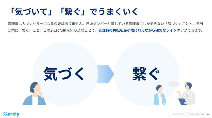 うまくいくラインケアのコツは、管理職の役割を「気づいて、繋ぐ」だけに絞ること。