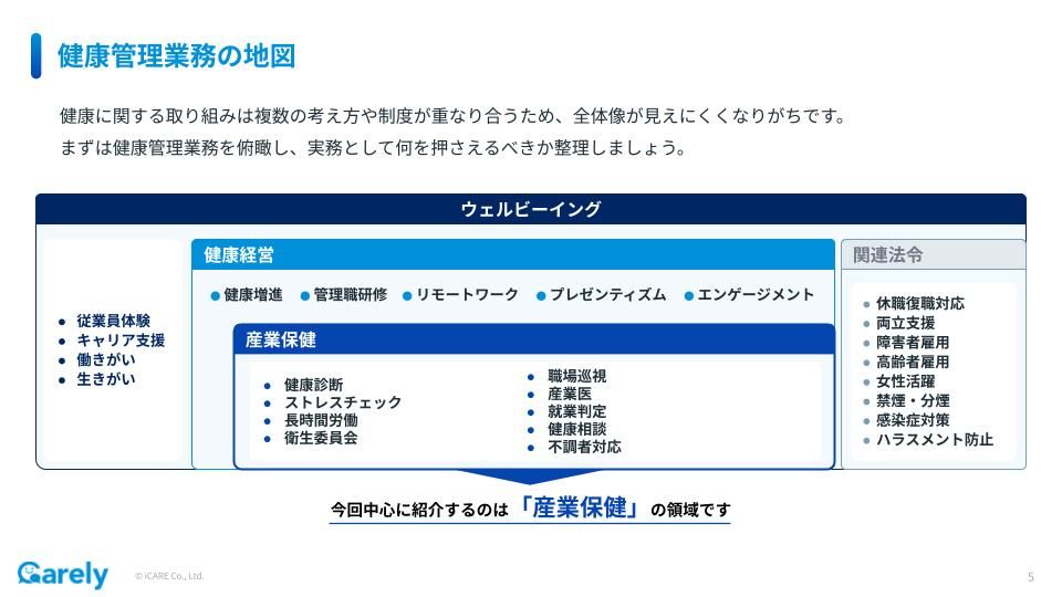 企業の持続的な成長を支えるために欠かせない「健康管理業務の全体像」を整理しています。