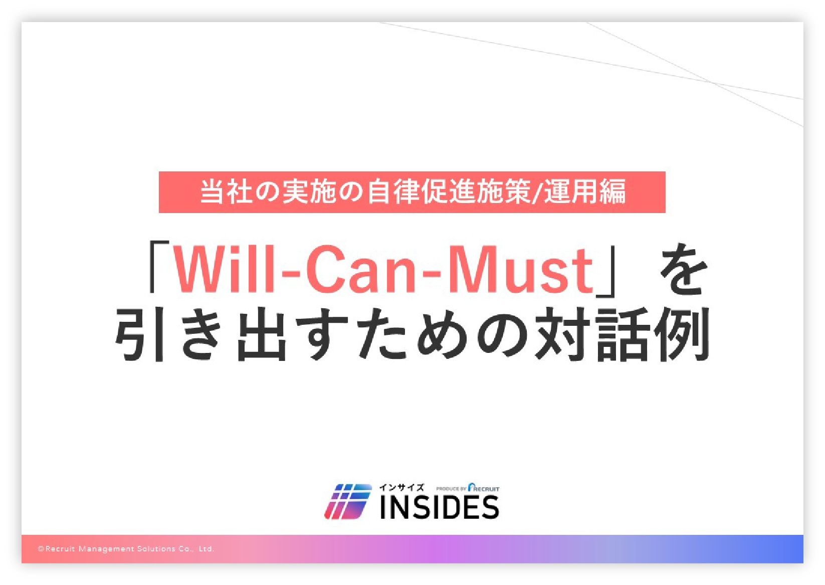 社員の自律を促すために「Will-Can-Must」のフレームワークを利用しているものの、いざ対話してみても「Will」がなかなか出てこなかいというお悩みはありませんか?本資料では、当社が実際に行っている社員の自律を促す施策を具体的な対話例を交えてご紹介します。