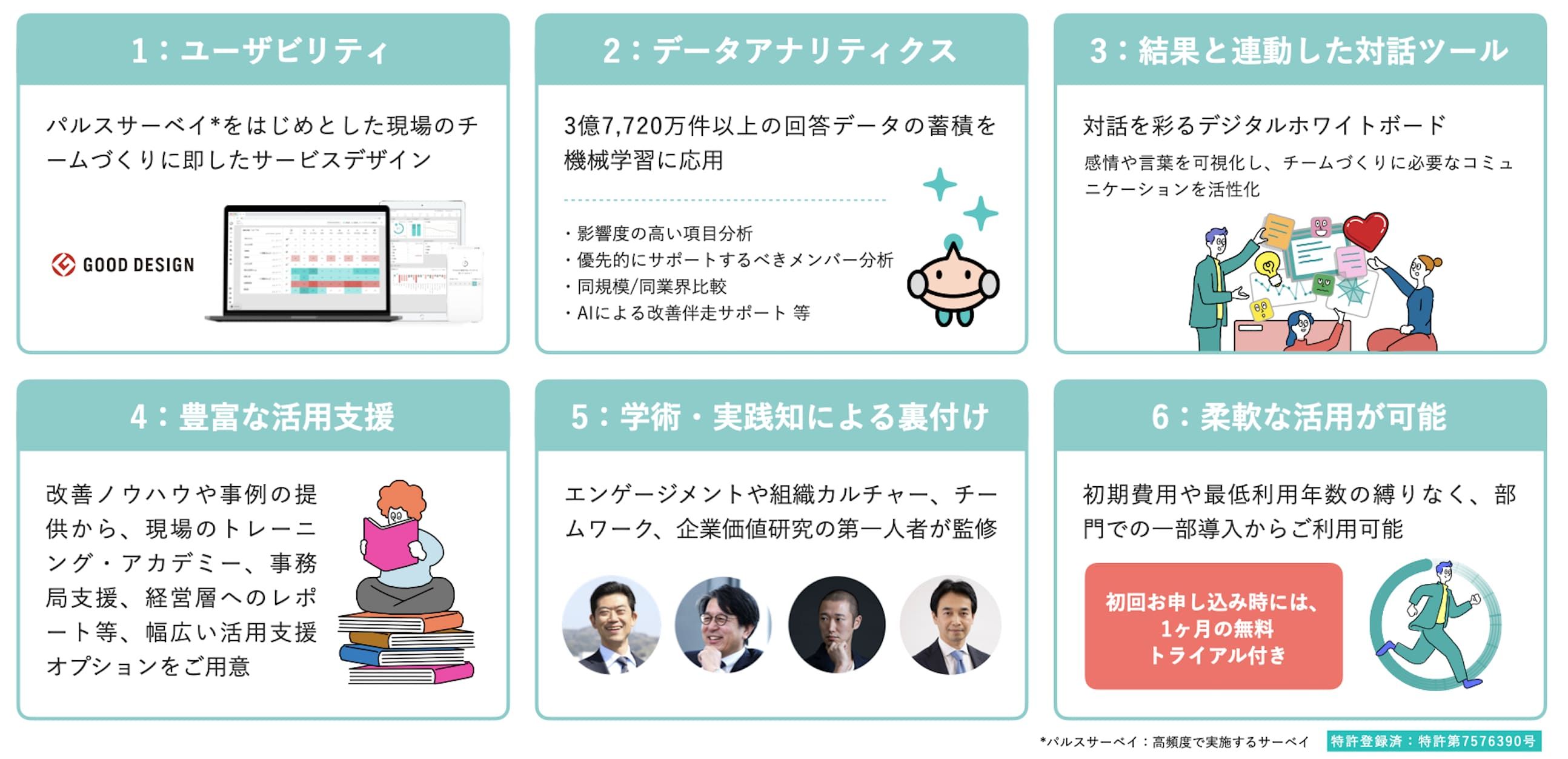 エンゲージメントデータを主軸に、チーム毎の特徴や強み・弱みが分かります。財務指標には現れない人的資本価値の可視化に、活用いただけます。