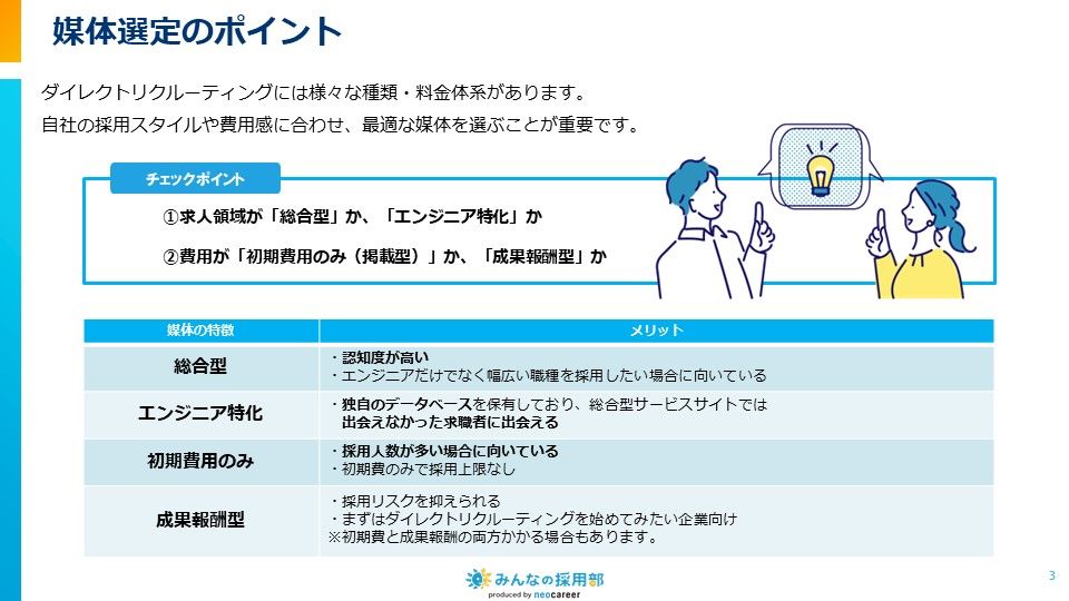 ダイレクトリクルーティングの媒体は色々な種類があります。自社のニーズを明確にし、媒体を選ぶことが重要です。