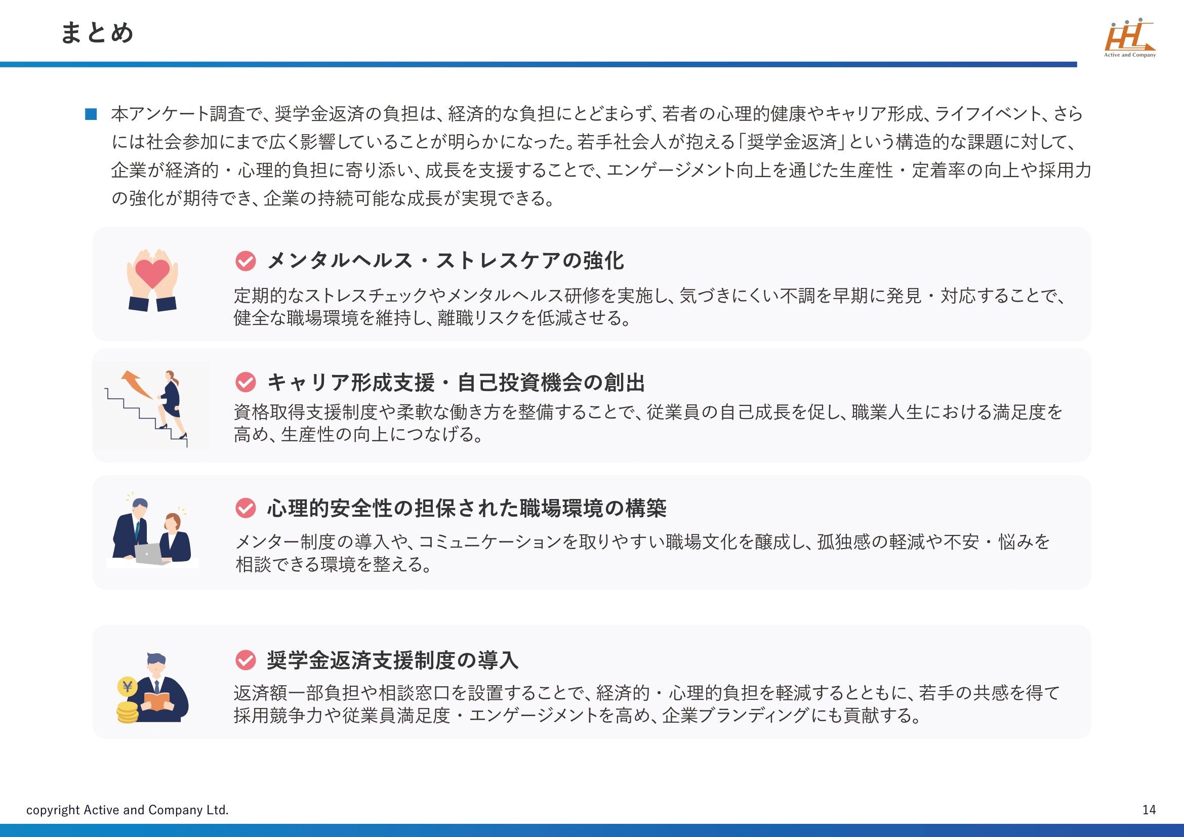奨学金を返済中の20代~40代の男女100名を対象に、奨学金返済がもたらす負担に関するアンケート調査を実施し、奨学金返済が単なる経済的な負担に留まらず、若手社会人の日常的な心理的ストレスとなり、健康、キャリア形成、ライフイベント、さらには社会参加にまで広範な影響を及ぼしている実態が明らかになりました。こうした結果から、奨学金返済は個人のライフスタイルだけでなく、採用競争力や定着率、組織エンゲージメントにも関わる大きな課題であることが見えてきます。