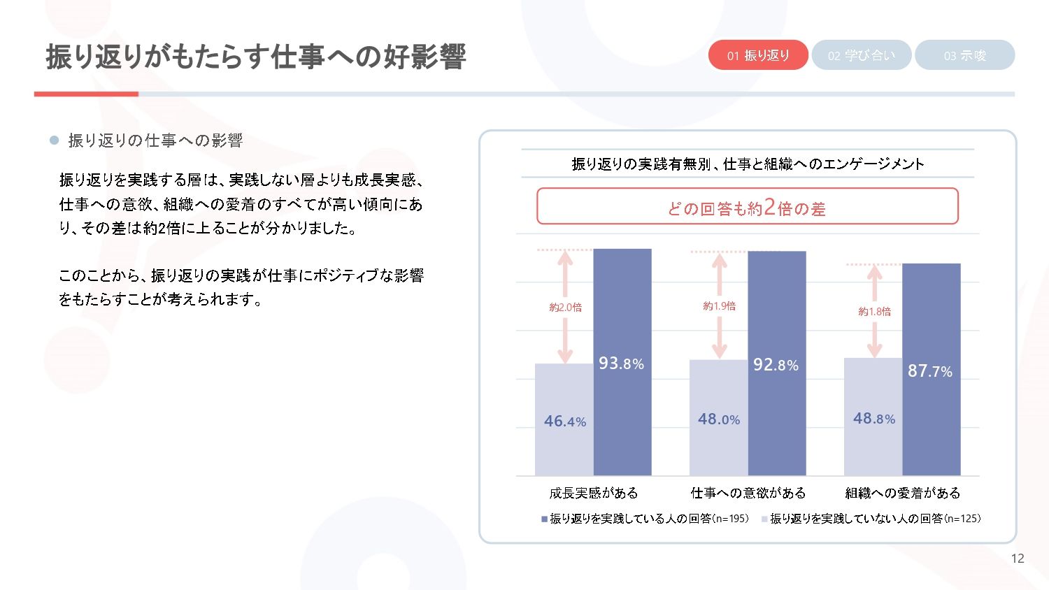 本調査から、日々の「振り返り」を実践する社員は、そうでない社員に比べ【成長実感・仕事への意欲・組織への愛着】がすべて約2倍高いことが判明しました。さらに「学び合い」の機会があると成長実感が約1.7倍高まります。
