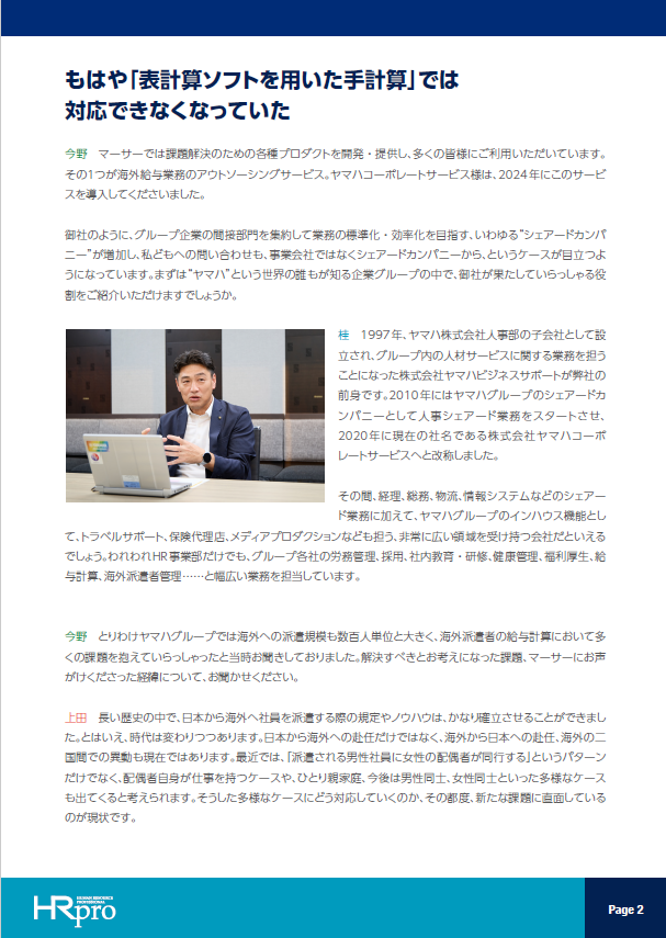 そうした状況を受け、ヤマハグループの人事、経理、総務、物流、ICTなどのコーポレート業務のシェアードサービス機能を担う株式会社ヤマハコーポレートサービスでは、マーサージャパンが提供する海外給与業務のアウトソーシングサービスを2024年より導入しました。