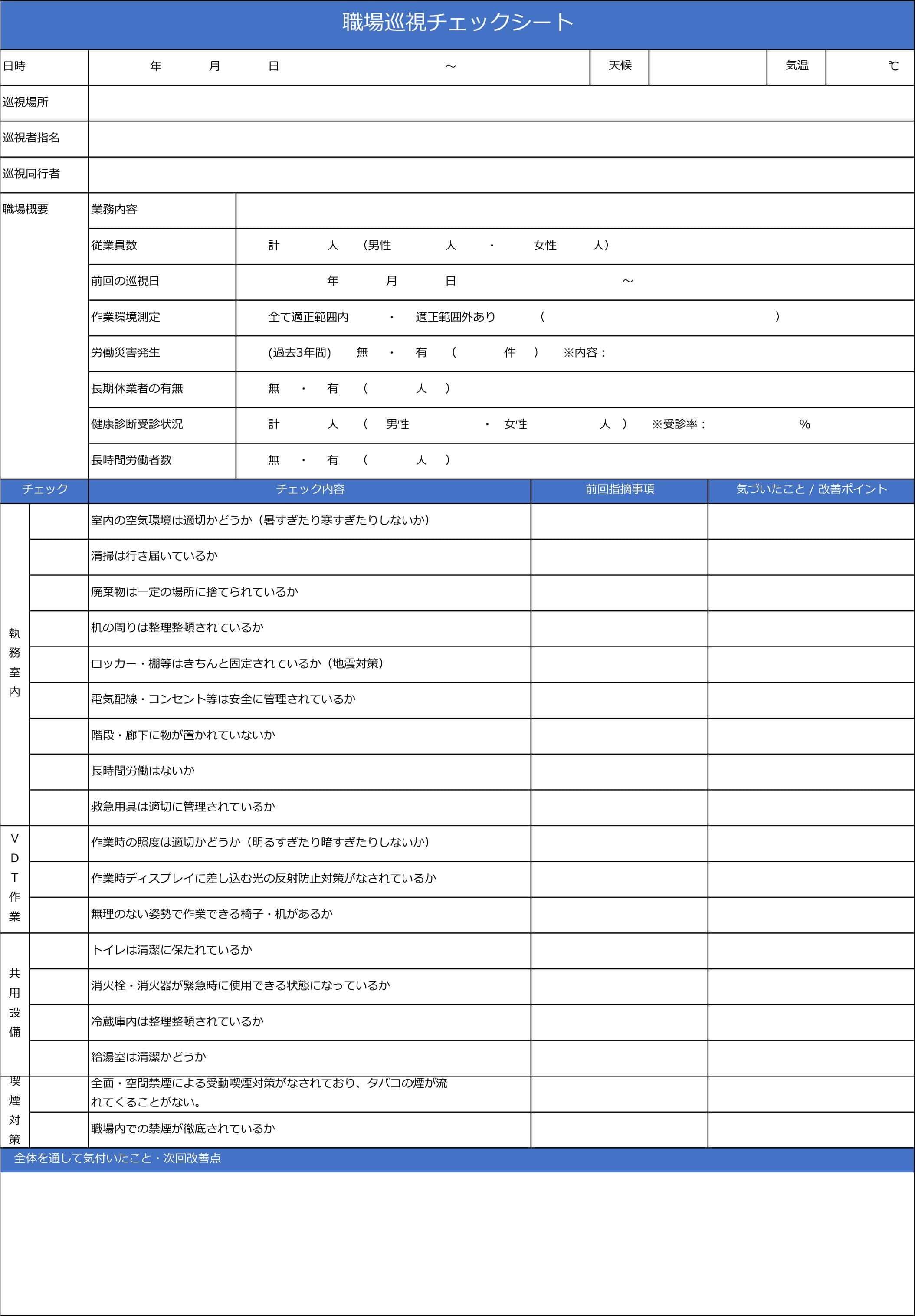 オフィスワーク中心の企業の人事担当者様や衛生管理担当者様に向けてExcel形式の「職場巡視チェックシート」をご用意いたしました。職場巡視をする際のチェック項目をまとめておりますので、初めて巡視を行う企業様はもちろん、より効果的、効率的に進めるにあたってお役立ていただけます。