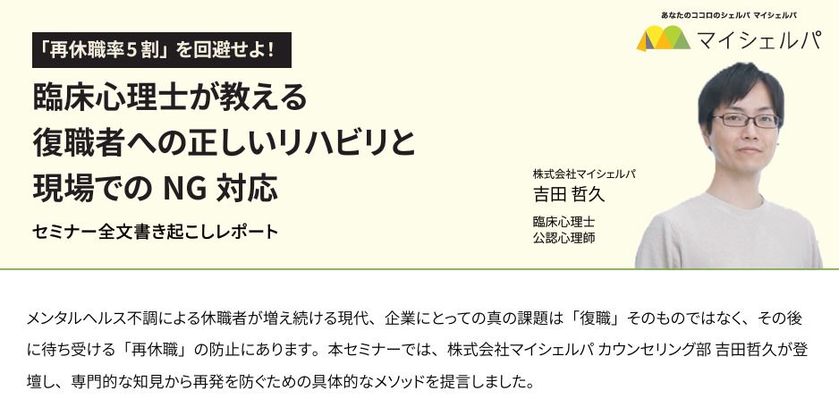 メンタルヘルス不調による休職者が増え続ける現代、企業にとっての真の課題は「復職」そのものではなく、その後に待ち受ける「再休職」の防止にあります。本資料は、株式会社マイシェルパ カウンセリング部 吉田哲久が登壇し、専門的な知見から休職の再発を防ぐための具体的なメソッドを提言したセミナーのレポートです。