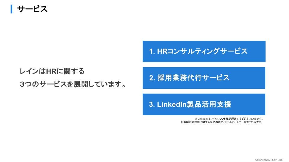 採用戦略の立案から母集団形成、内定までをワンストップで支援する「HRコンサルティング」、人事の立ち位置で実務を担う「採用業務代行(RPO)」、そして国内でも希少な「LinkedIn製品活用支援」という3つの主要サービス内容をご紹介しています。