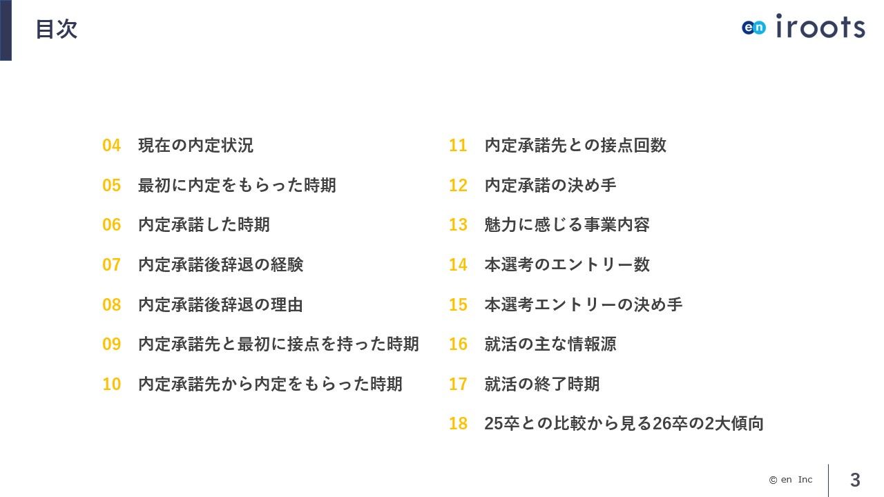 本資料では26卒の就活生122名に取ったアンケートをもとに、平均内定数や内定承諾の決め手、企業との接点回数など、全15項目をおまとめしました。