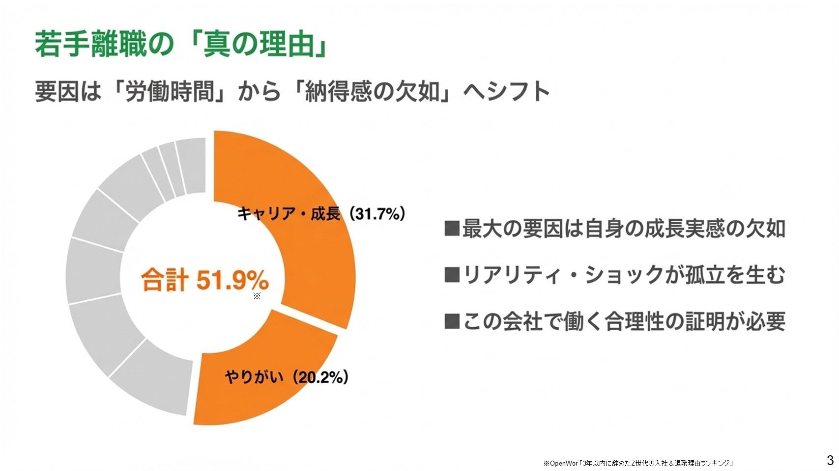本資料は、新入社員の早期離職を防ぐための「90日プラン」を軸に、オンボーディングを再設計する実践ガイドです。近年、離職理由は「待遇」から「納得感」へとシフトしており、特に入社初期の体験が定着に大きく影響しています。