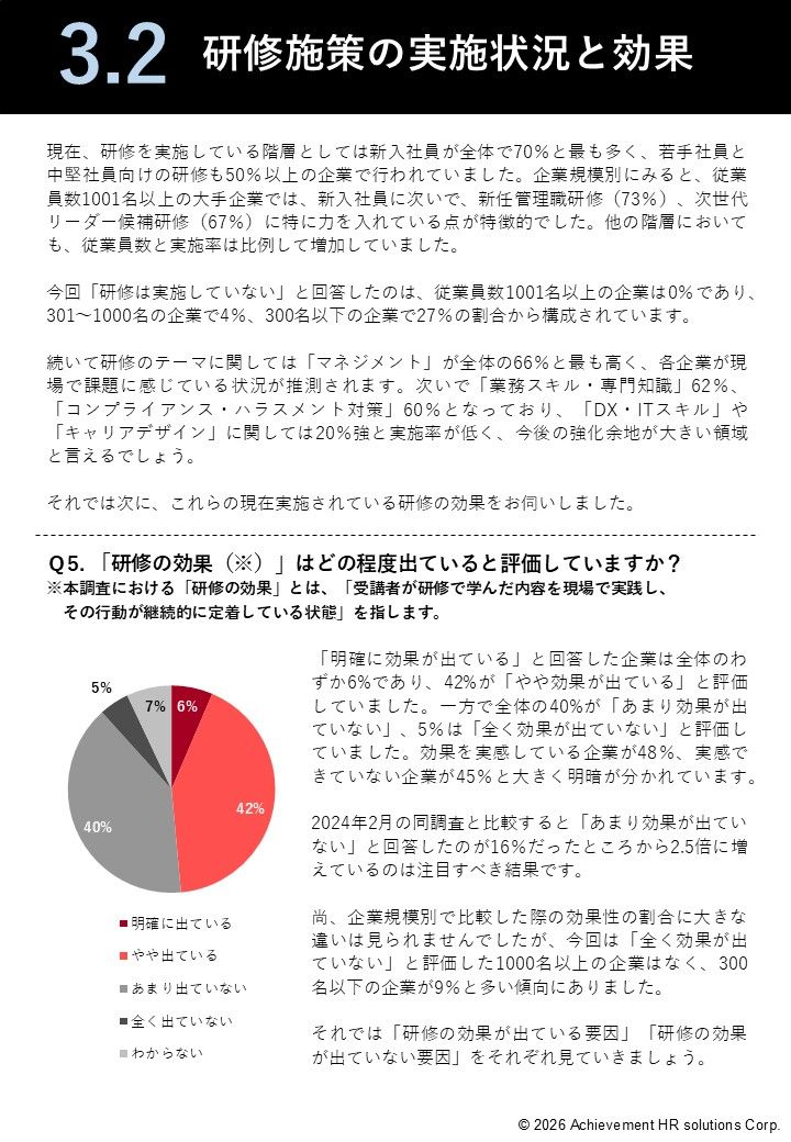 この定義に基づき、現在の研修施策がどの程度成果に結びついているかの実態を浮き彫りにします 。