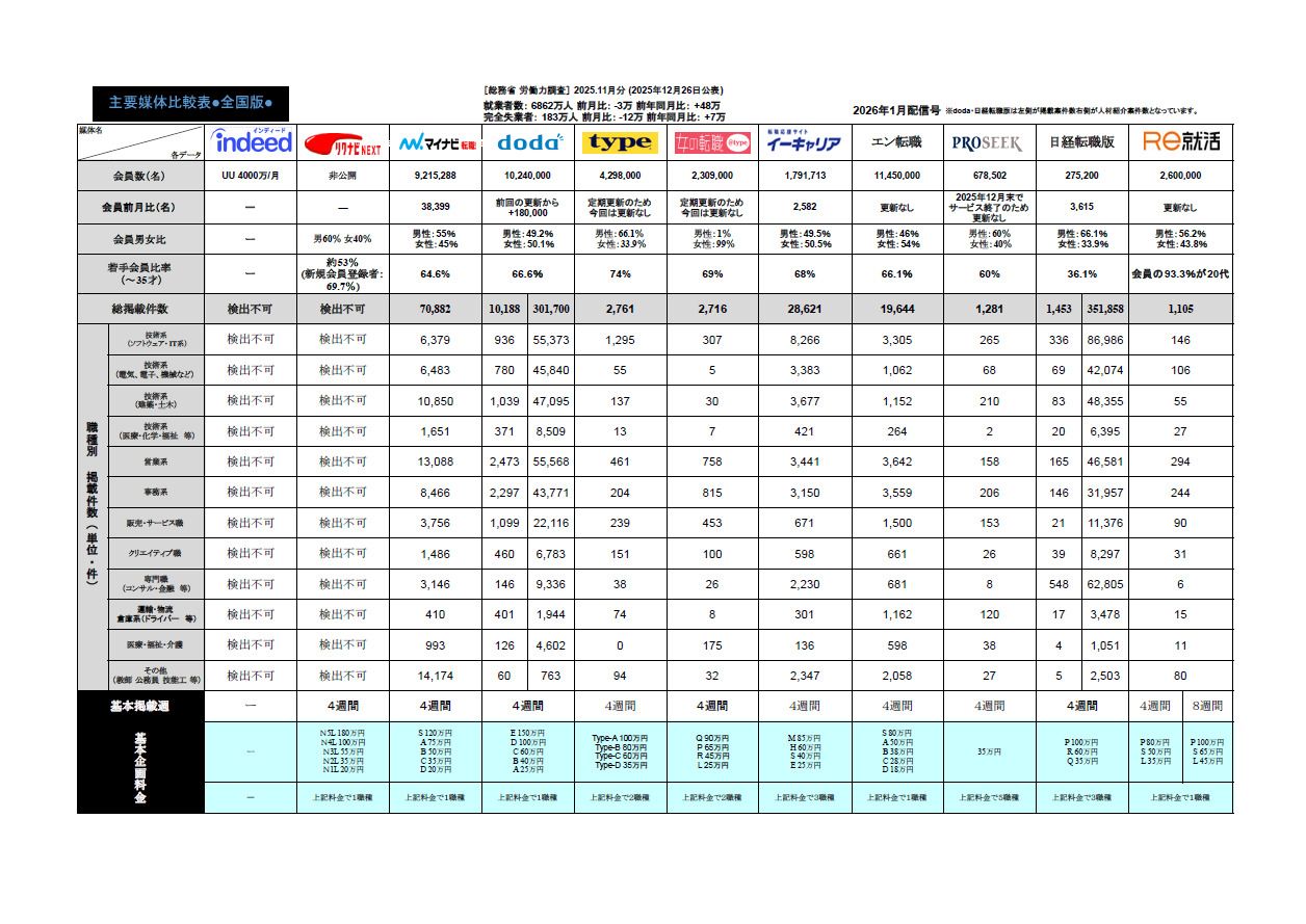 【2025年12月度】知らないとヤバイ!求人広告主要媒体比較表(リクナビNEXT・マイナビ転職・他)