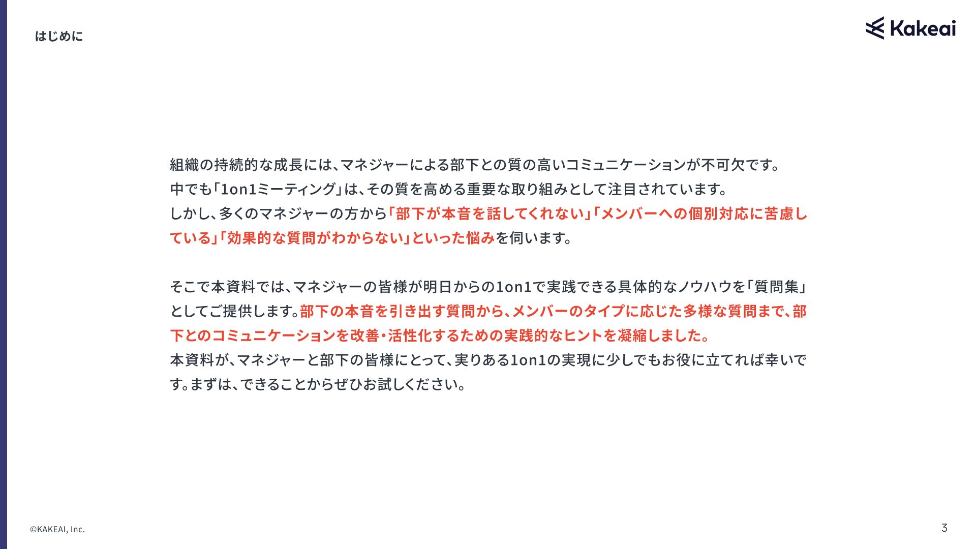 そこで本資料では、マネージャーの皆様が明日からの1on1で実践できる具体的なノウハウを「質問集」としてご提供します。