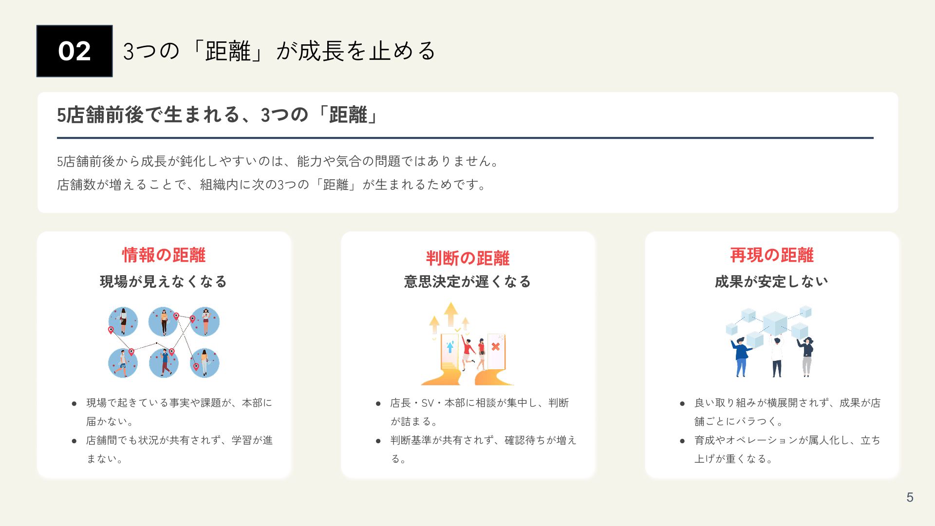 店舗数が増えるほど現場は忙しくなり、本部も現場の状況が見えづらい…。「5店舗前後」を境に組織運営の難易度が上がり、売上・品質・採用などの成果を安定させづらくなります。