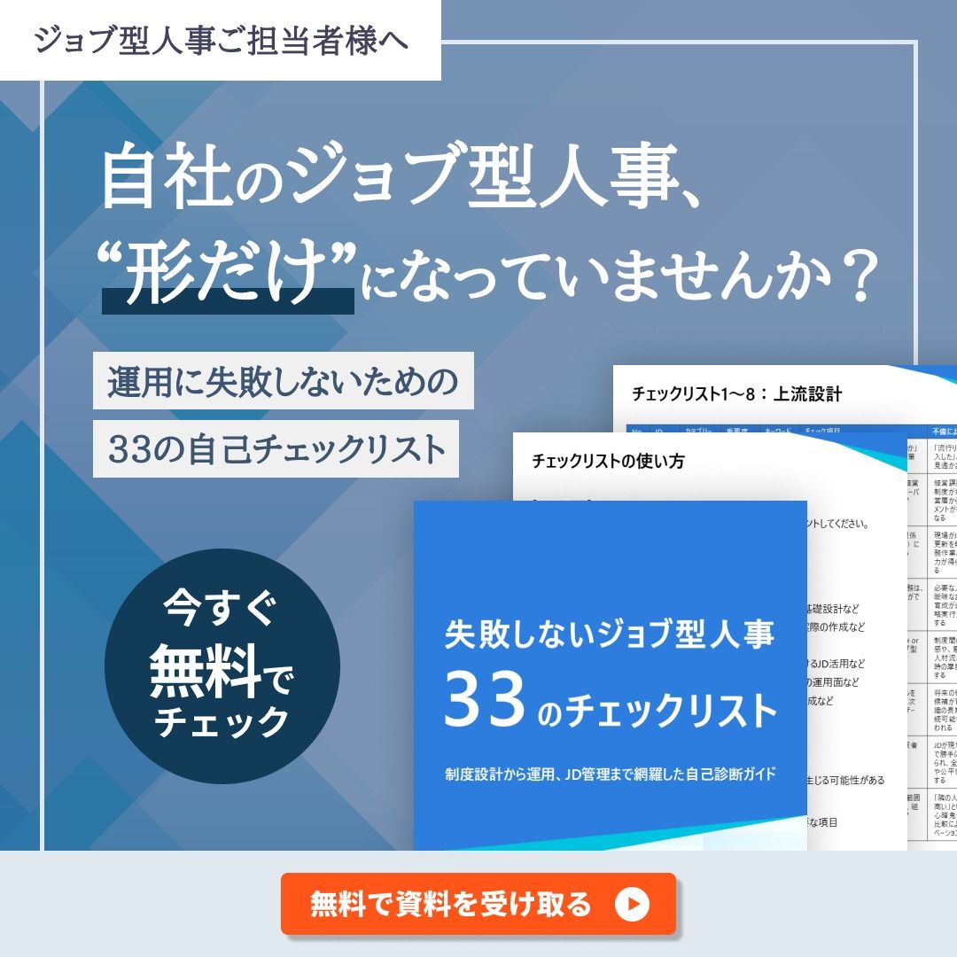 ジョブ型人事の戦略/制度設計/運用・施策展開の観点から、貴社のジョブ型人事が「実効性のある(=失敗しない)状態」にあるかを判定するための、33のチェックリストを公開。