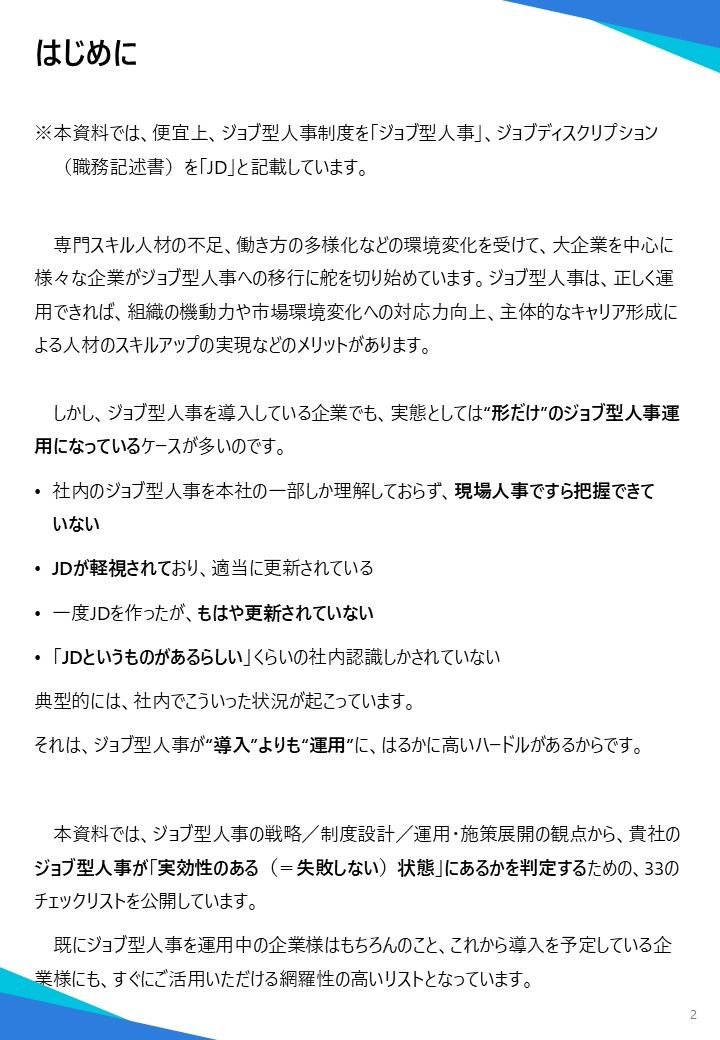 400社以上と対話したプロの視点で作成されたジョブ型人事の健全性を測るチェックリストと、それらの詳細な解説を公開しています。