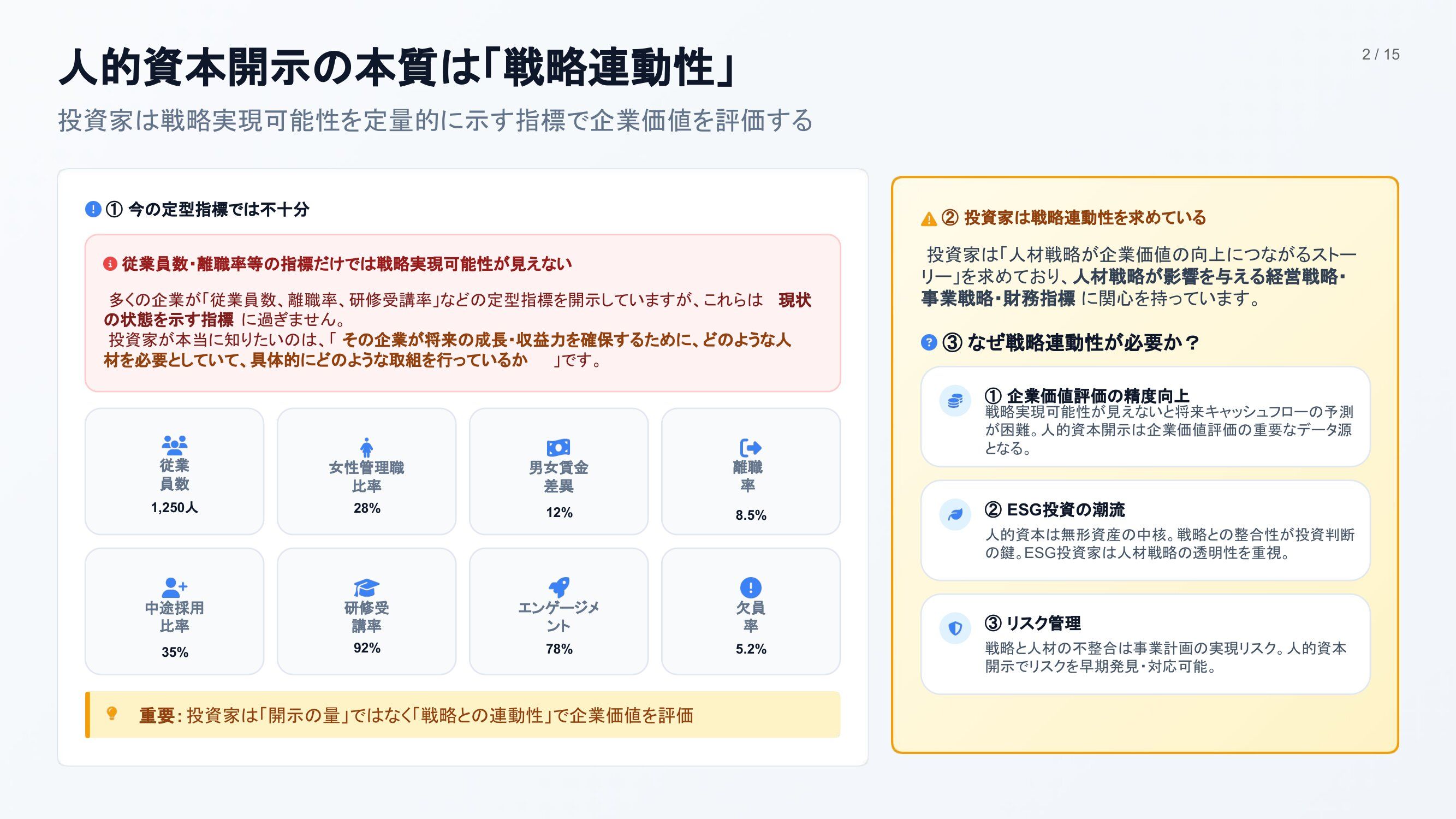人的資本開示の本質は「経営戦略との連動性」。投資家は戦略の実現可能性を定量的に示す指標で企業価値を評価します。