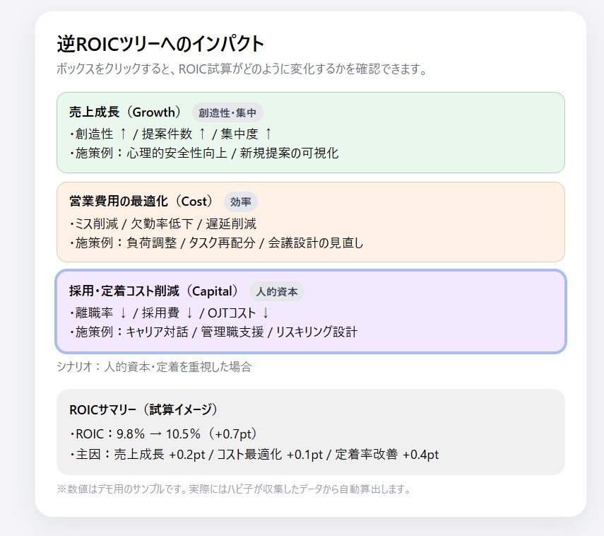 さらに、幸福度の改善が売上成長・コスト最適化・採用定着といった指標にどのように影響し、ROIC向上に接続されるかを「逆ROIツリー」として可視化。加えて、日報分析を通じた離職予兆検知やアラート設計など、人的資本経営・開示を見据えた実務的な活用シナリオも提示。幸福を定性的な概念に留めず、測定・介入・経営成果へとつなぐ新しい人的資本経営のアプローチを提案します。
