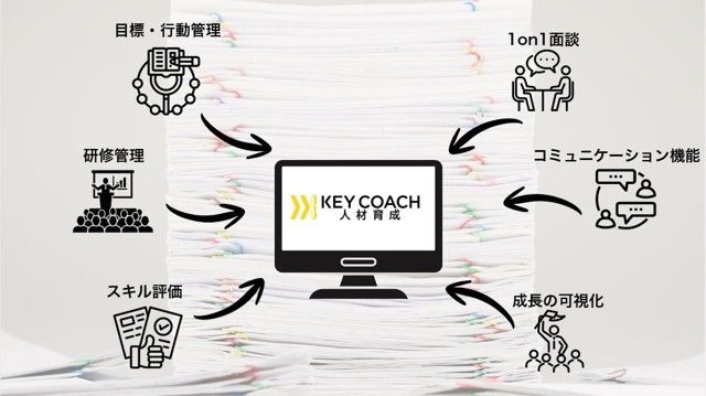 『KEY COACH 人材育成』は、研修・OJT・1on1面談の記録をクラウド上で一元管理し、評価と実践データを組織で共有できるクラウドサービスです。
