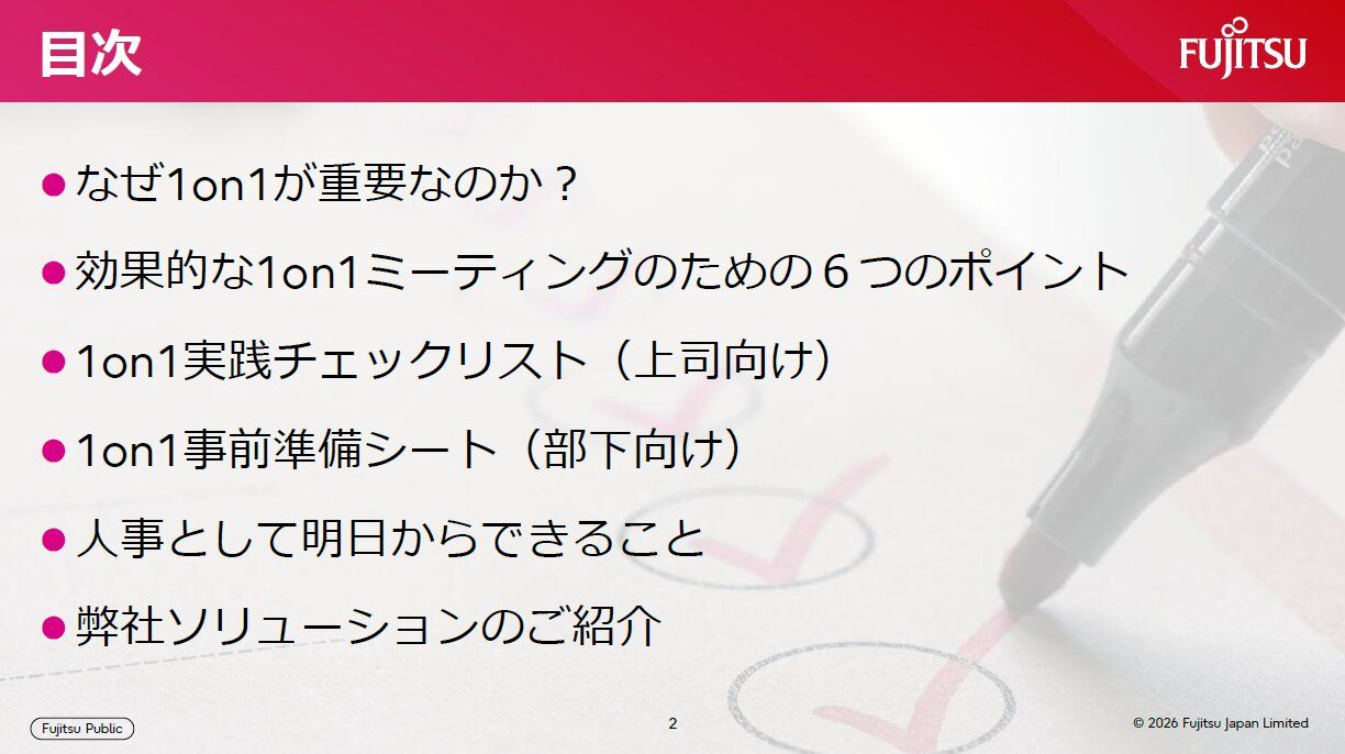 本資料 「生産性とエンゲージメントを高める!1on1実践ガイド」 では、効果を最大化するための具体的な手法として 「効果的な1on1ミーティングのための6つのポイント」 をご紹介。明日からすぐに実践できる具体的なノウハウを提示します。