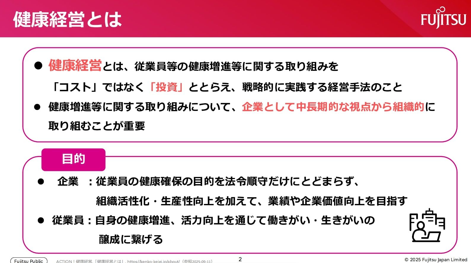 本資料では、健康経営の基本概念とその重要性を改めて解説し、取り組むことで企業が得られる多角的なメリットを明確にします。また、健康経営優良法人認定取得も視野に入れたフレームワークと、実際に健康経営に取り組む際のポイントを紹介します。また、令和7年度健康経営調査票の主な変更点について解説します。
