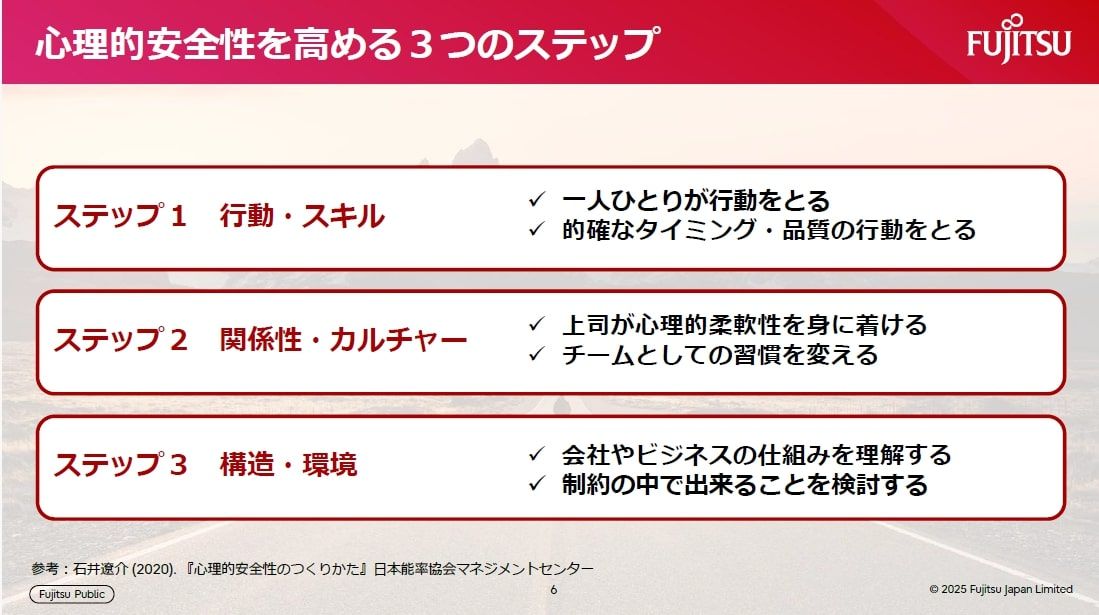 さらに、心理的安全性を組織に根付かせ、高めていくための具体的な「3つのステップ」をご紹介し、人事担当者として明日からチームや組織にポジティブな変化をもたらすために何ができるのか、アクションを提案します。