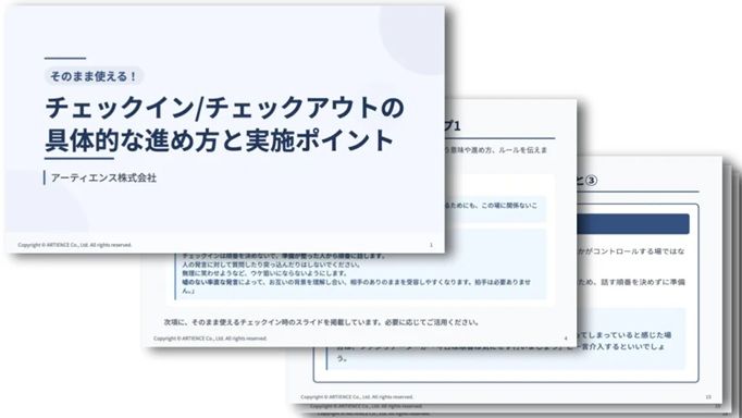 本資料では、会議でチェックイン/チェックアウトを取り入れるための具体的な進め方を、ステップごとに分かりやすく紹介しています。