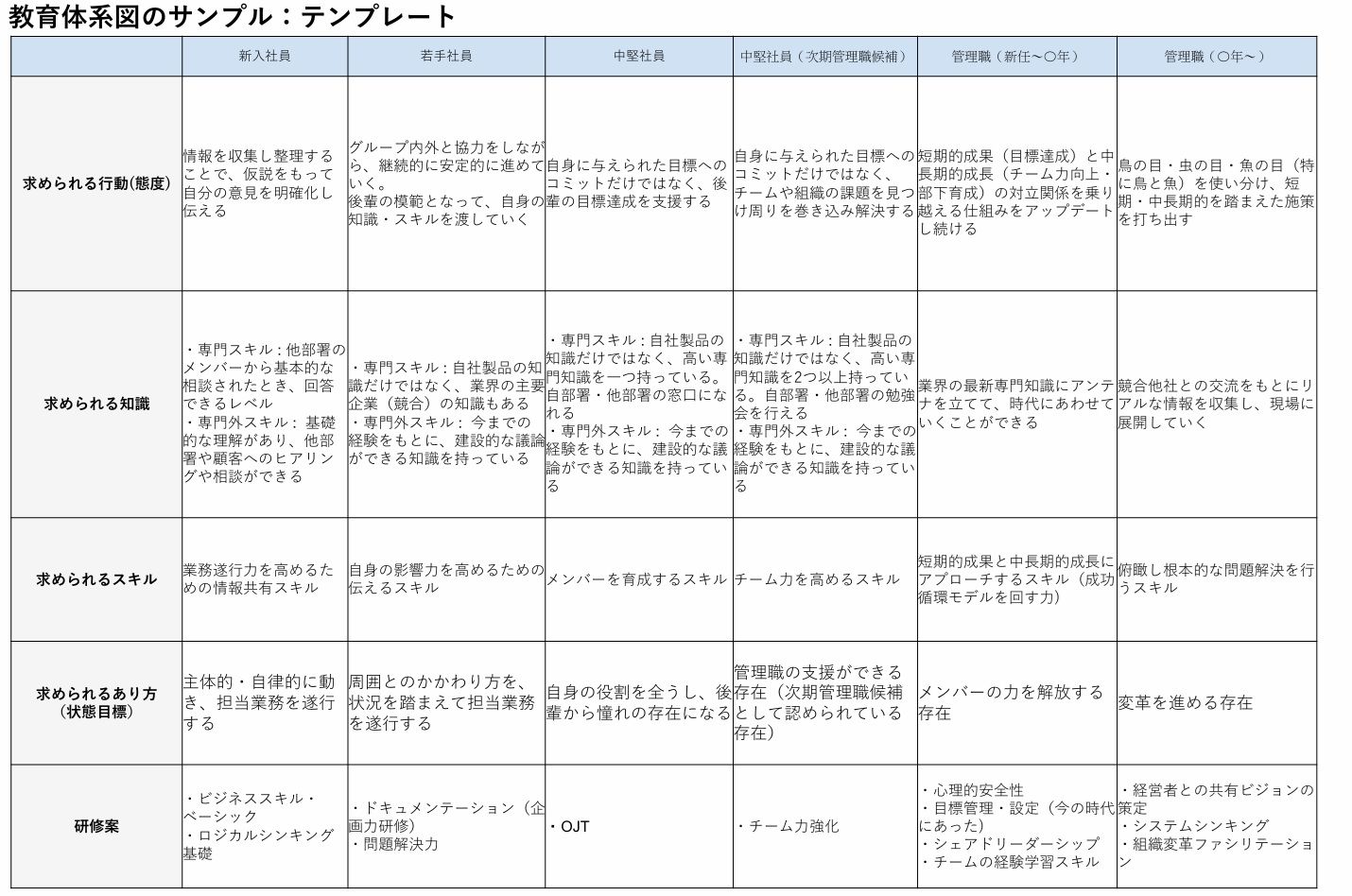 本資料は、新入社員から管理職までの成長段階を「行動(態度)・知識・スキル・あり方」の4区分で整理した教育体系図です。各階層において求められる役割や行動(主体的行動、後輩育成、部門横断の課題解決、変革推進など)例が記載されており、人事が自社の人材育成方針を整理する際の基盤として利用できます。