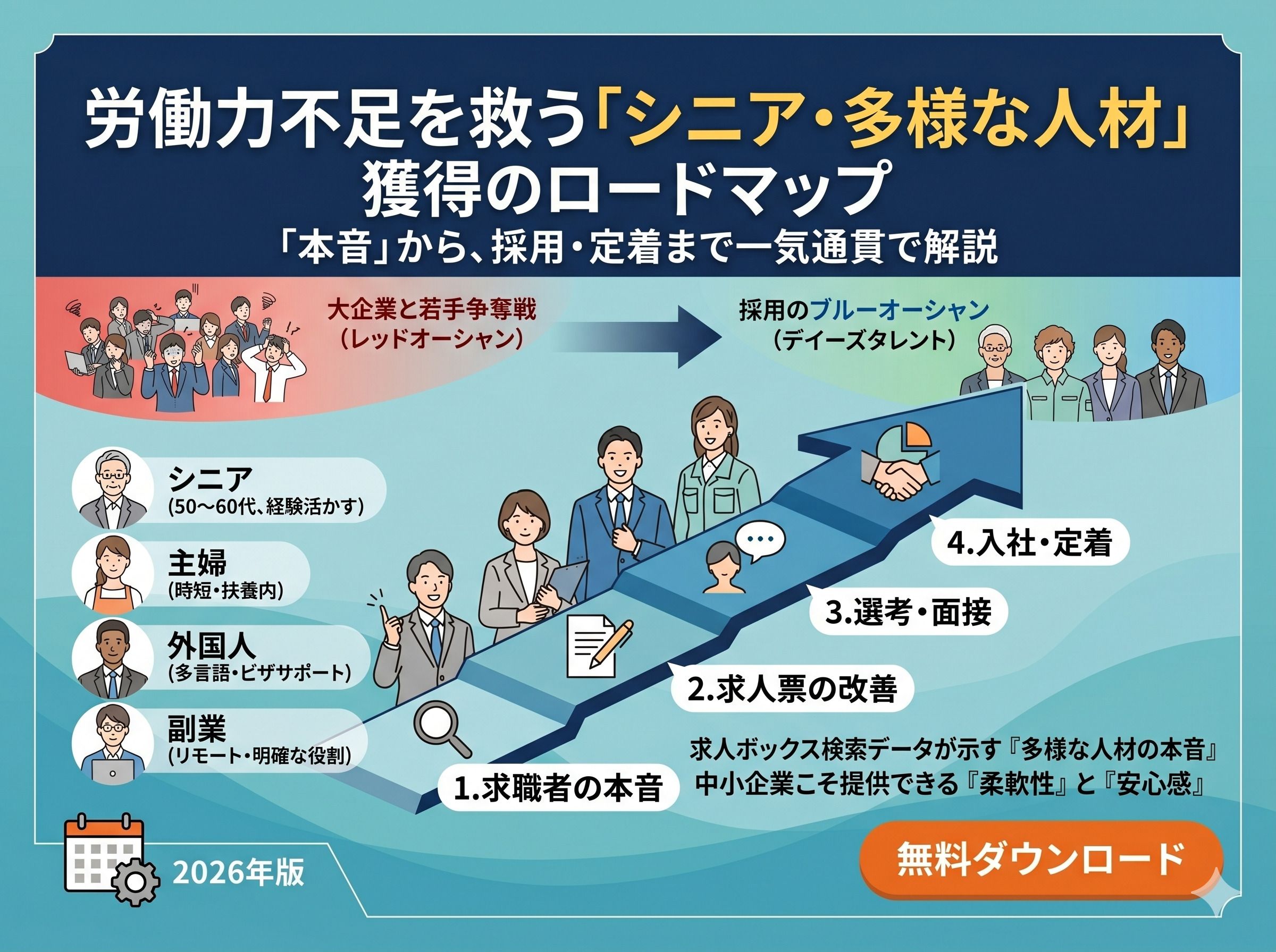 視点を変えると、シニア・主婦(夫)・外国人・副業人材といった「多様な人材」が、強い就労意欲を持ちながらも自分に合った環境を探しています。大企業が対応しにくい「個別最適化された柔軟な働き方」こそが中小企業の最大の武器であり、彼らの「不安」や「本音」に寄り添った採用設計を行うことで、全く競争のないブルーオーシャンを切り拓くことが可能です。