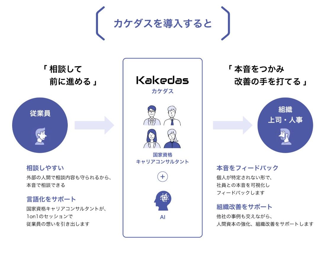 | 事業概要 | ●Kakedas: 国家資格キャリアコンサルタントのみが登録する日本最大級のキャリア面談/社外1on1プラットフォーム。プロの第3者が対応する“本音”を話せる安心な場、社外キャリア相談窓口として従業員向けのキャリア面談・社外1on1を提供。またキャリア面談とセットでの研修も実施(グループ会社ジェイックと連携し、各種研修+フォロー面談等にも対応) ●Kakedasキャリア相談(個人向け): キャリアコンサルタントを選んで、オンラインで相談。1回から利用できる「転職を前提としない」キャリア相談サービス ●KakedasWorks: 国家資格キャリアコンサルタントへの業務委託や採用を実施できるBPOサービス。数百人規模~単発の講師や面談依頼まで ●Kakedas for Student: 大学や専門学校、高校など教育機関のキャリアセンター/就職支援におけるキャリア相談や講師業務を対応 ●リスキリング・アドバイザー・キャリアコンサルタント養成講習: 生成AI時代に求められるリスキリング×キャリア形成資格を取得(一般社団法人日本リスキリングキャリアコンサルタント協議会JRCAと連携) |