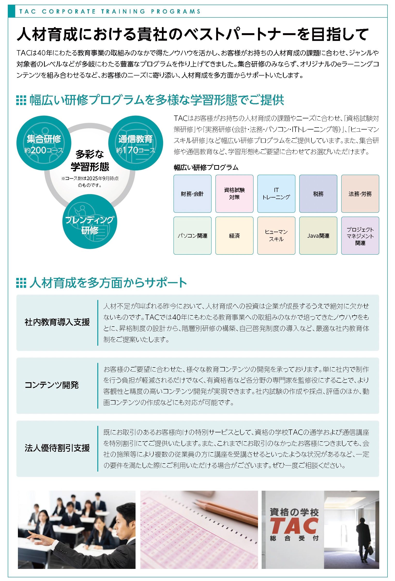 TACは、公認会計士や情報処理技術者等の個人向け資格教育事業で培ってきたコンテンツやノウハウと、法人研修事業での研修や教育サービスの実績があります。