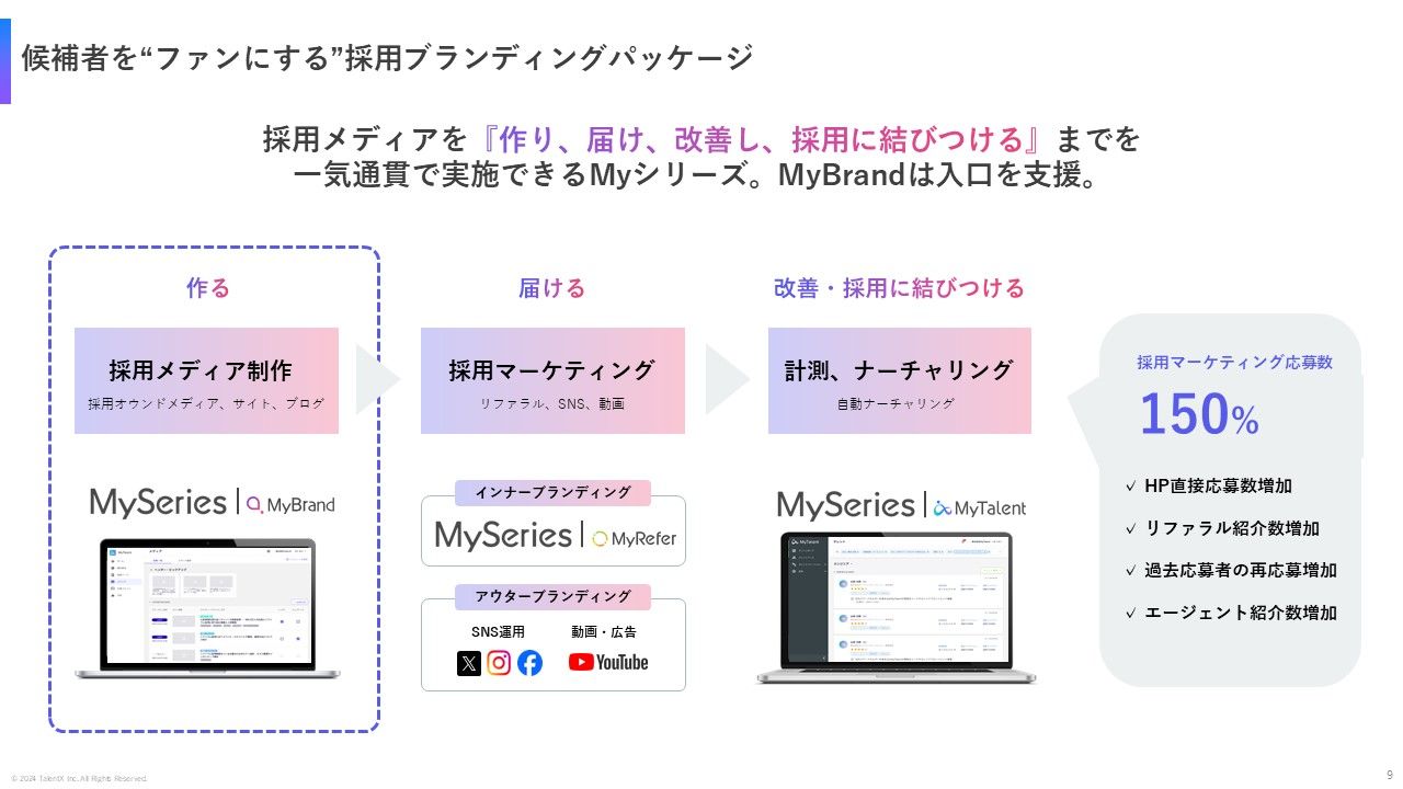 既存サービスの採用MAサービス「MyTalent」やリファラル採用サービス「MyRefer」との連携により、自社の候補者のファン度合いをスコア化したり、タレントプールから応募獲得までのプロセスの半自動サポートや、社員による知人友人へのおすすめコメントが採用オウンドメディアを彩る仕組みを構築させます。これにより、相乗効果を持って自社の採用ブランディングを加速させ、候補者をファンにする仕組み化につながります。