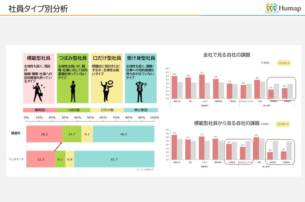 主体性・目的意識から社員の特性を4つのタイプで分類し、全社の傾向でみる自社の課題と模範社員から見る課題を比較し、本質的な課題を発見できます。