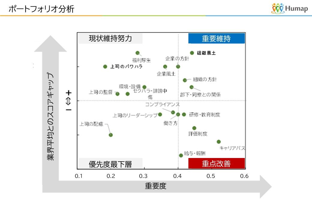 課題の重要度と優先度を整理した分析レポートを提供。膨大な人事データの中から「次は何をすべきか」を明確にし、最短ルートでの組織改善を導きます。