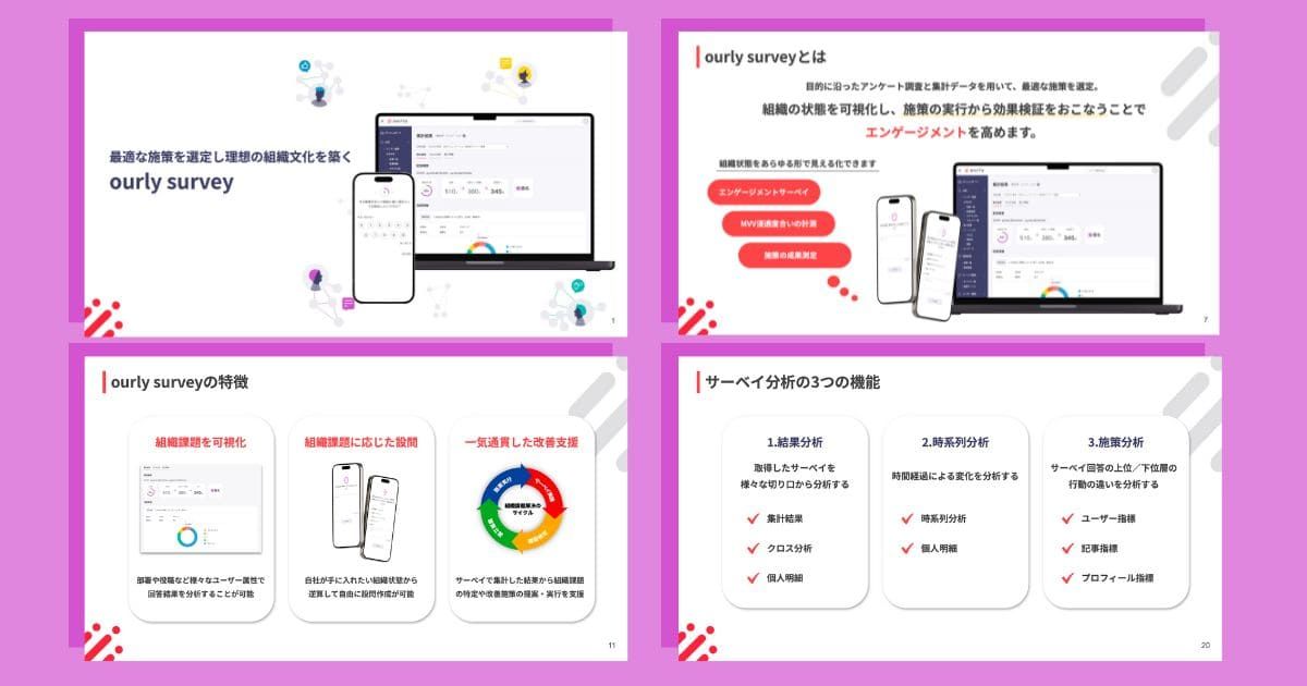 ourly surveyでは、期待していた部署・役職別の分析だけでなく、2回目以降も改善するためのプランまで一緒に考えていただけているため、「測るだけで終わっていない」と実感しています。